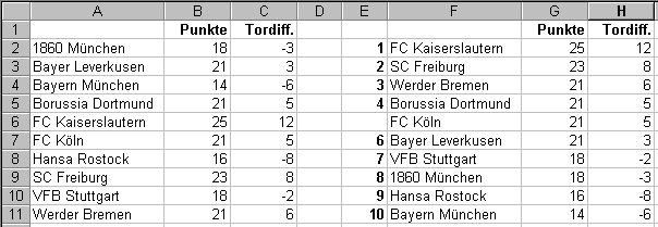 Es liegt eine alphabetische Vereinsliste mit den jeweils erzielten Punkten und der Tordifferenz vor. Hieraus soll ohne zu sortieren automatisch die Tabelle generiert werden.