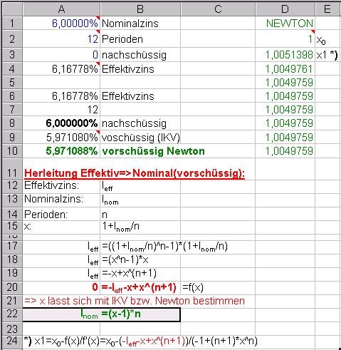 Das erledigen auch die excelinternen Funktionen EFFEKTIV und NOMINAL; - aber nicht vorschüssig und schlimmer: das ADD-IN Analyse-Funktionen muss geladen sein.