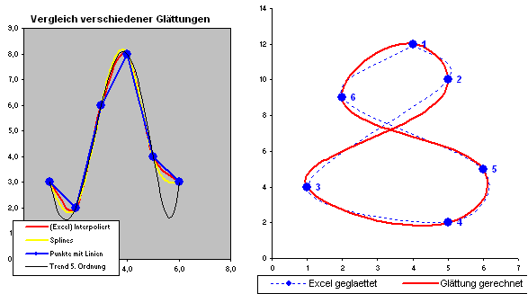 Natürliche und Kubische Splines sind ein Verfahren zur Glättung von Datenreihen. Folgendes Download zeigt, wie man sie erzeugt und vergleicht sie mit der "hauseigenen" Funktions-Interpolation von Excel