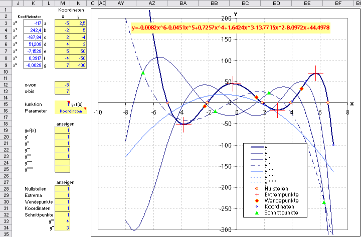 In diesem Chart werden Polynome bis zur 6. Ordnung der Form y=a+bx+cx^2+dx^3+ex^4+fx^5+gx^6 sowie die dazugehörigen Ableitungen berechnet und angezeigt. Ausserdem können Extrema, Nullstellen, Wendepunkte und Schnittpunkte angezeigt werden.