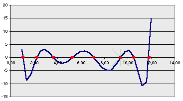 In folgendem Download wird gezeigt, wie man von Polynomen bis 8. Ordnung alle Nullstellen in einem vorgegebenen x-Werte-Intervall ermitteln und in einem Diagramm darstellen kann.