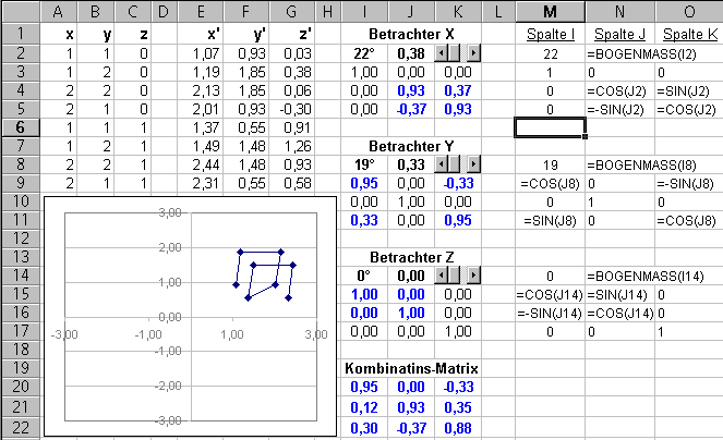 Im Bereich I1:K17 stehen 3 3x3-Matrizen. Jede ist für die Drehung um